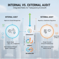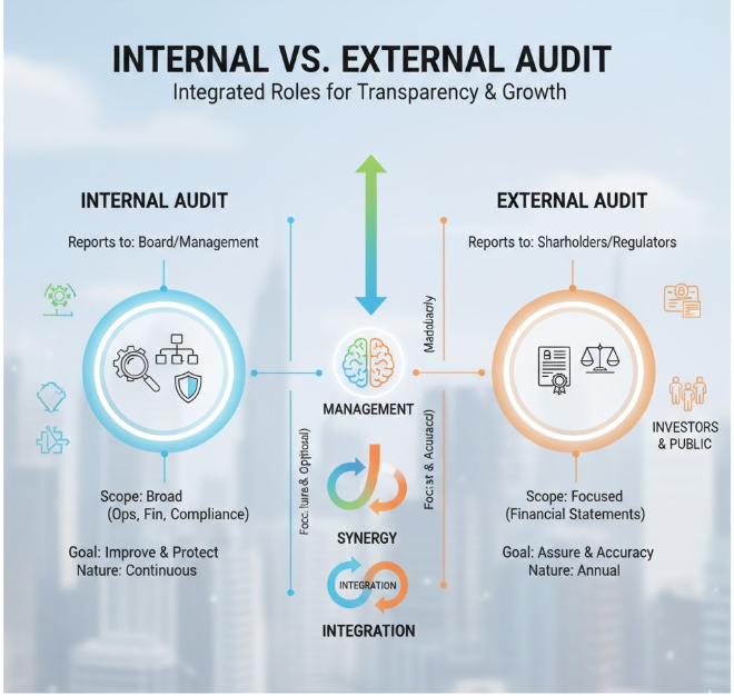 التكامل الرقابي: رحلة في التدقيق الداخلي والخارجي وكيف يقودان المؤسسة نحو الاستدامة